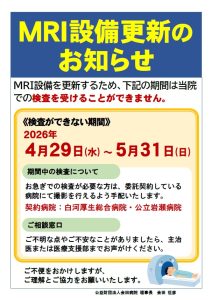 入れ替えに伴う作業期間中におきまして、当院でのMRI検査を一時休止いたします。